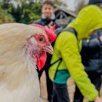 Weiter ging es, weg vom strengen Schweinegeruch zu Obstwiesen und Sträuchern. Zwischen Apfel-, Birnen-, Zwetschgen-, Quitten- und Marillenbäumen pickten Hühner und grasten Schafe. Der Weg über die Obstweide barg für Viele kein geruchliches, aber ein taktiles Problem. Auch mit den wildesten Verrenkungen war dem Schafdung und dem Hühnermist kaum auszuweichen. Das aus dem Stall genommene Huhn saß zufrieden auf dem Arm und genoss die wenigen Streicheleinheiten. Die meisten der Schüler trauten sich dann doch nicht, es anzufassen. Hähne krähten und machten ganz klar, wer wo der Boss ist. Die Hühner entstammen einer Kreuzung steirischer Sulmtaler Hennen und französischer Les Bleues Gockel. Diese Bressehuhn-Kreuzung ist ein sogenanntes Zweinutzungshuhn. Die Hennen legen Eier, die Hähne setzen Fleisch an- und werden so auch genutzt und nicht gleich nach dem Schlüpfen getötet.