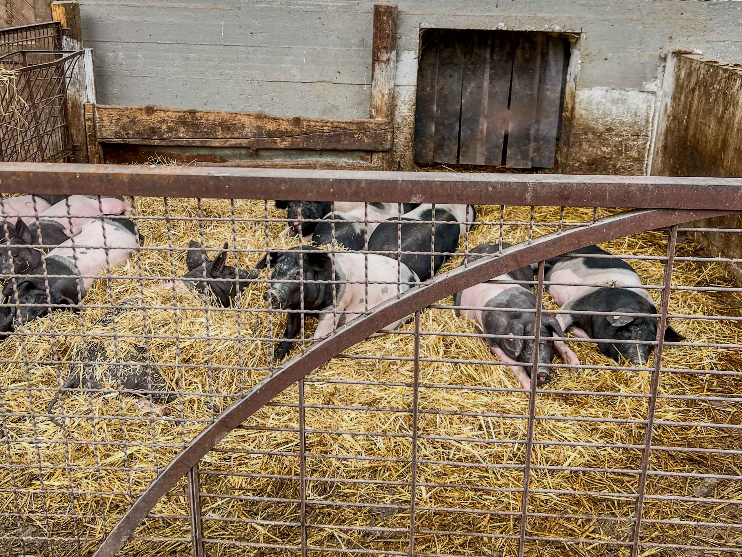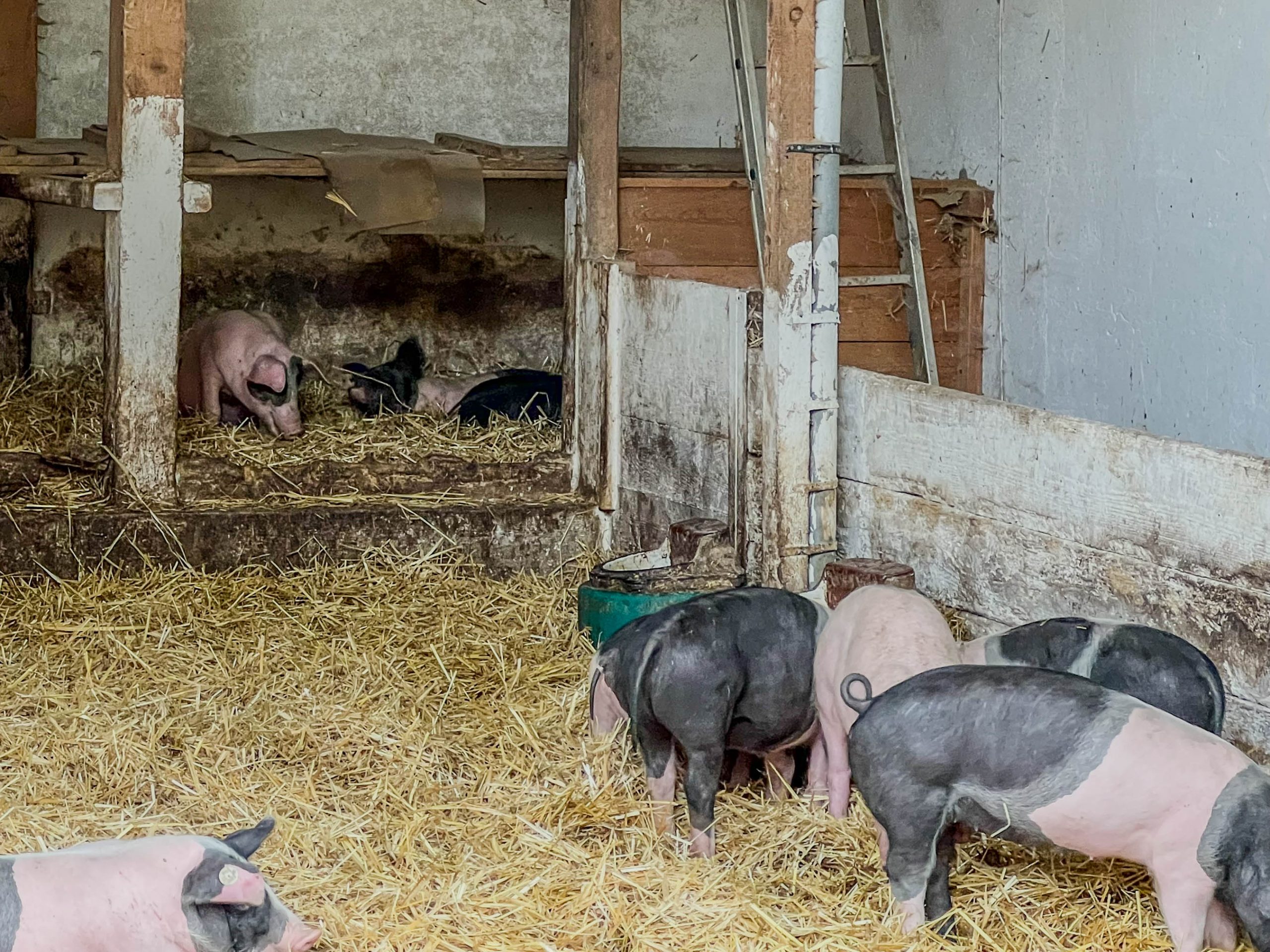 Nach einem kurzen Blick in die Käserei und Erklärung wie Käse entsteht, ging es zu den Schweinen. Schnell verschwanden Nasen in Rollkragen, Schal oder Jackenkragen. „Boah, was stinken die, dabei sehen sie ganz sauber aus“. Rosa-schwarz-gefleckte Teenagerferkel ärgerten ihre gleichaltrigen Artgenossen, knufften, schubsten und jagten sich und die, die ihre Ruhe haben wollten, grunzten genervt- ganz wie im Schulalltag der Teenager auf der anderen Seite des Zauns. Bei den Gewichtsschätzungen von drei Wochen alten Ferkeln und 200kg schweren Muttersauen lagen viele ganz richtig. Leider waren die übrigen Schweine, die nicht gerade Ferkel hatten und draußen im Wald leben, zum Beobachten zu weit weg vom Hof.
