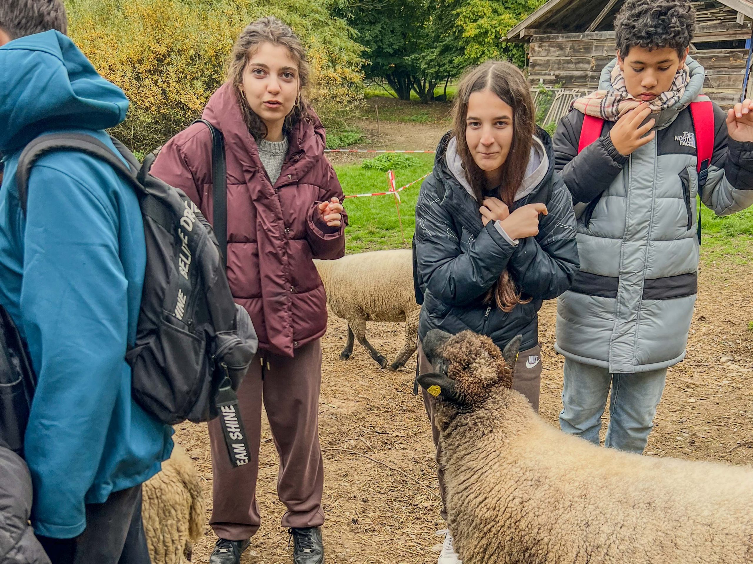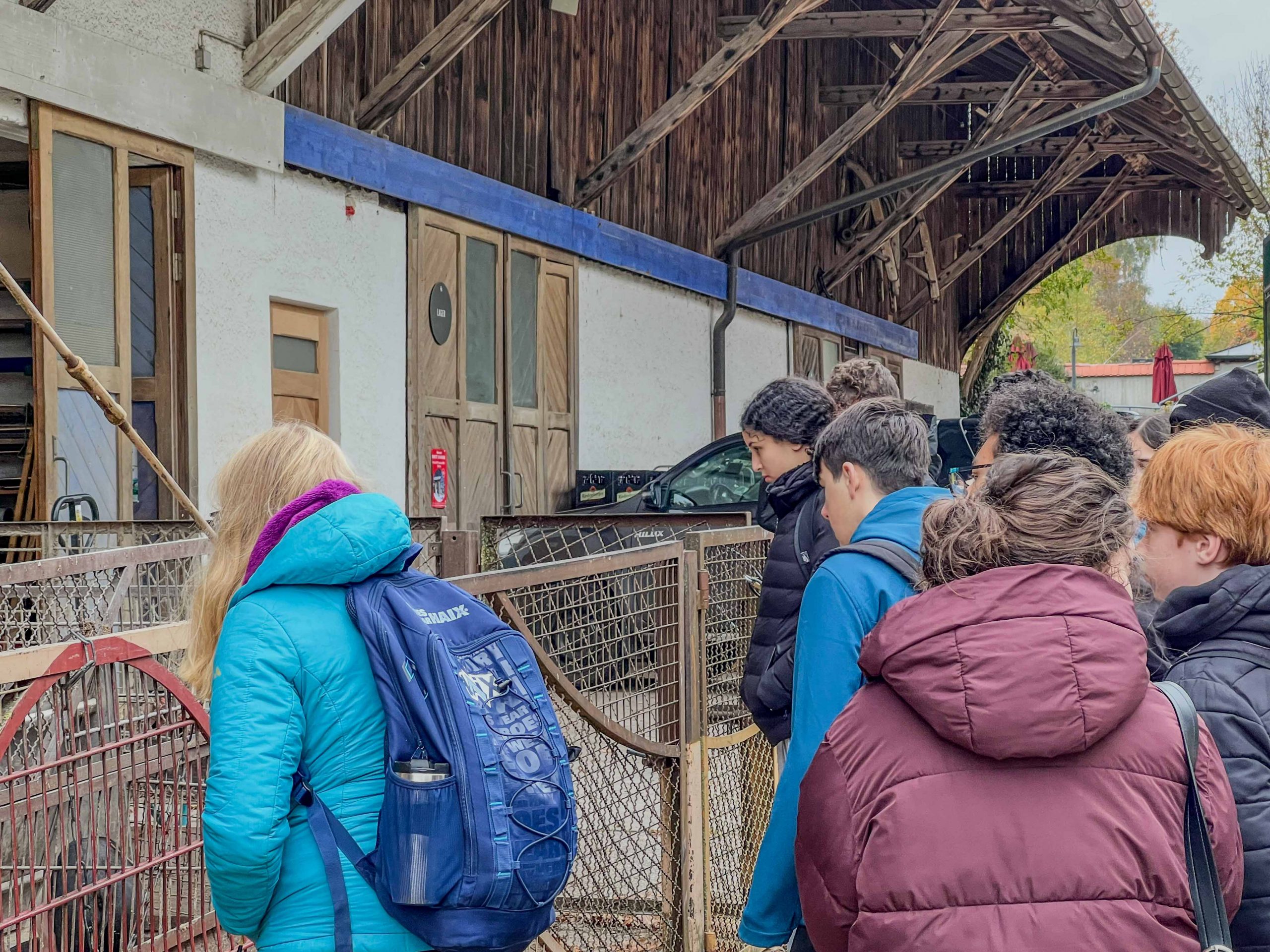 Neugierig mischten sich Schafe in Erwartung auf Futter und Streicheleinheiten unter die Schüler und Schülerinnen. Die ursprünglich aus England stammenden Shropshire flößten dann doch so manchem „coolen“ Schüler Respekt ein. Als alles Futter verteilt war, ging es außen an der Metzgerei vorbei zurück zum Hof. Uns wurde erklärt, dass die Rinder von den umliegenden Höfen angeliefert werden, sie aber vor dem Schlachten mindestens noch eine Nacht mit ordentlich Stroh, Futter und Wasser verwöhnt werden. Das gebiete nicht nur der Respekt vor dem Leben der Tiere, sondern das merke man auch dem Fleisch und der Wurst geschmacklich an. Die Rinder, die an diesem Freitag angeliefert wurden, hatten Glück, sie durften noch das ganze Wochenende ihr Leben genießen.