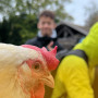 Weiter ging es, weg vom strengen Schweinegeruch zu Obstwiesen und Sträuchern. Zwischen Apfel-, Birnen-, Zwetschgen-, Quitten- und Marillenbäumen pickten Hühner und grasten Schafe. Der Weg über die Obstweide barg für Viele kein geruchliches, aber ein taktiles Problem. Auch mit den wildesten Verrenkungen war dem Schafdung und dem Hühnermist kaum auszuweichen. Das aus dem Stall genommene Huhn saß zufrieden auf dem Arm und genoss die wenigen Streicheleinheiten. Die meisten der Schüler trauten sich dann doch nicht, es anzufassen. Hähne krähten und machten ganz klar, wer wo der Boss ist. Die Hühner entstammen einer Kreuzung steirischer Sulmtaler Hennen und französischer Les Bleues Gockel. Diese Bressehuhn-Kreuzung ist ein sogenanntes Zweinutzungshuhn. Die Hennen legen Eier, die Hähne setzen Fleisch an- und werden so auch genutzt und nicht gleich nach dem Schlüpfen getötet.