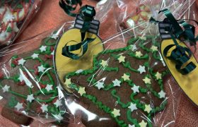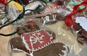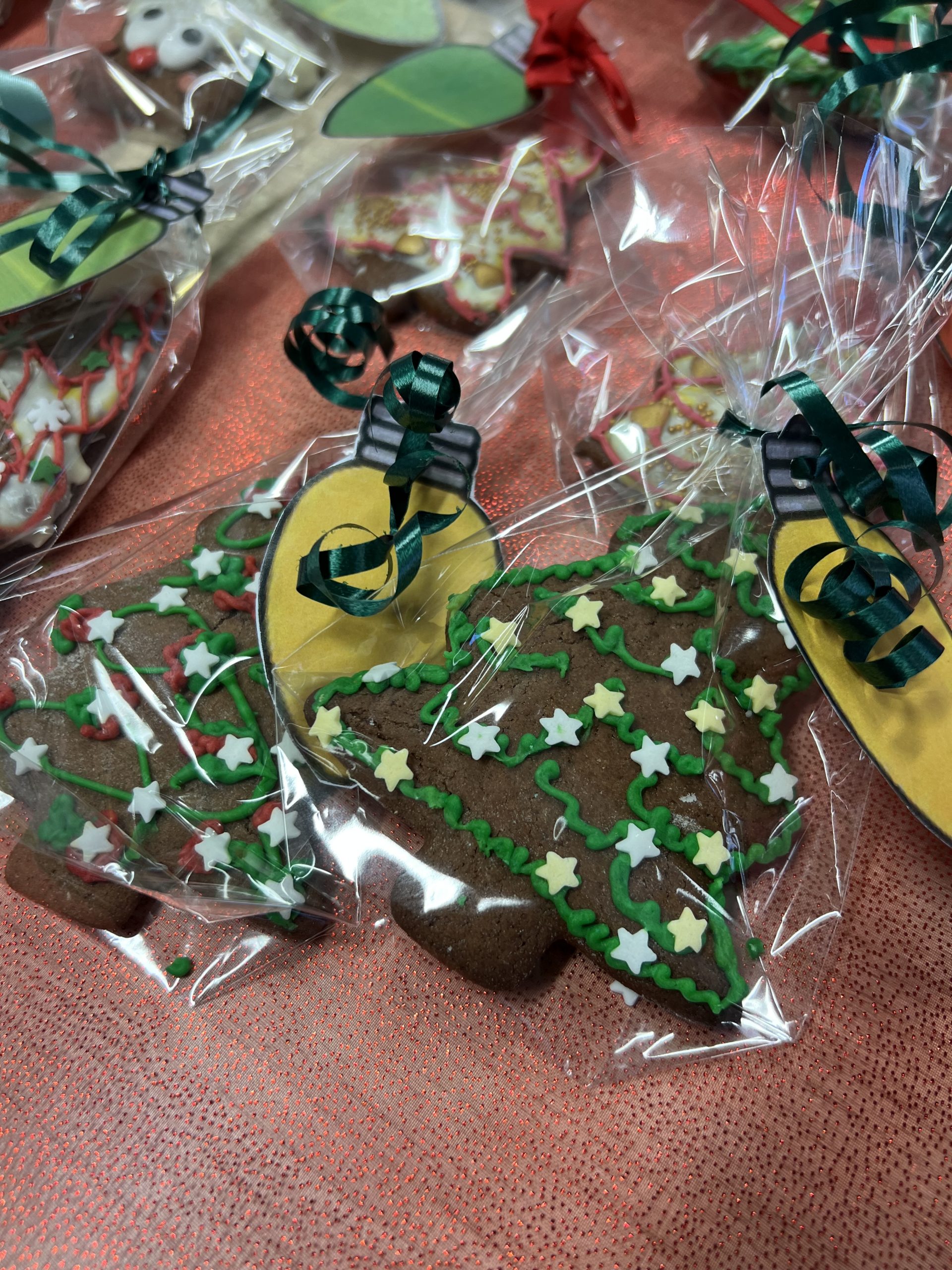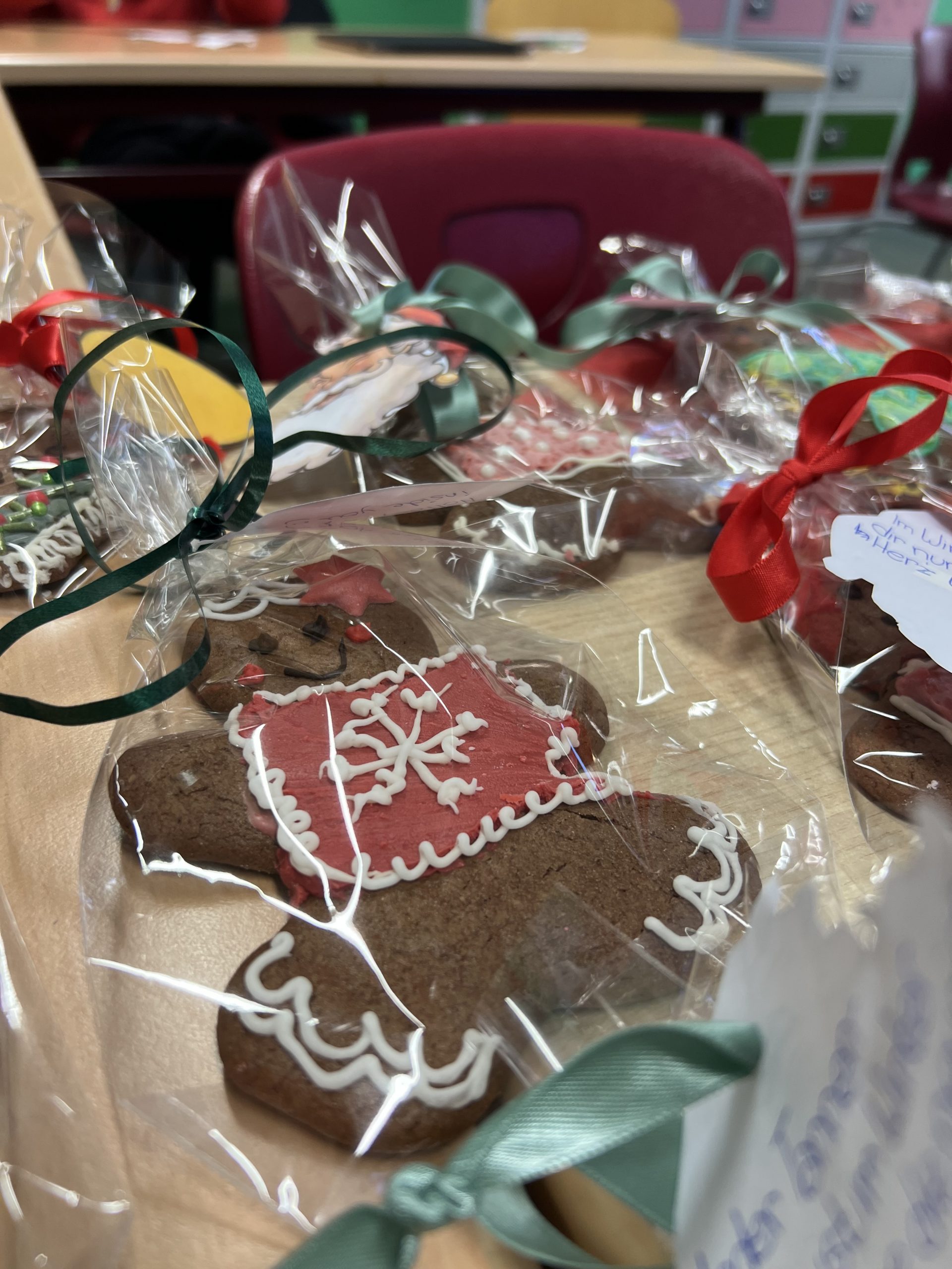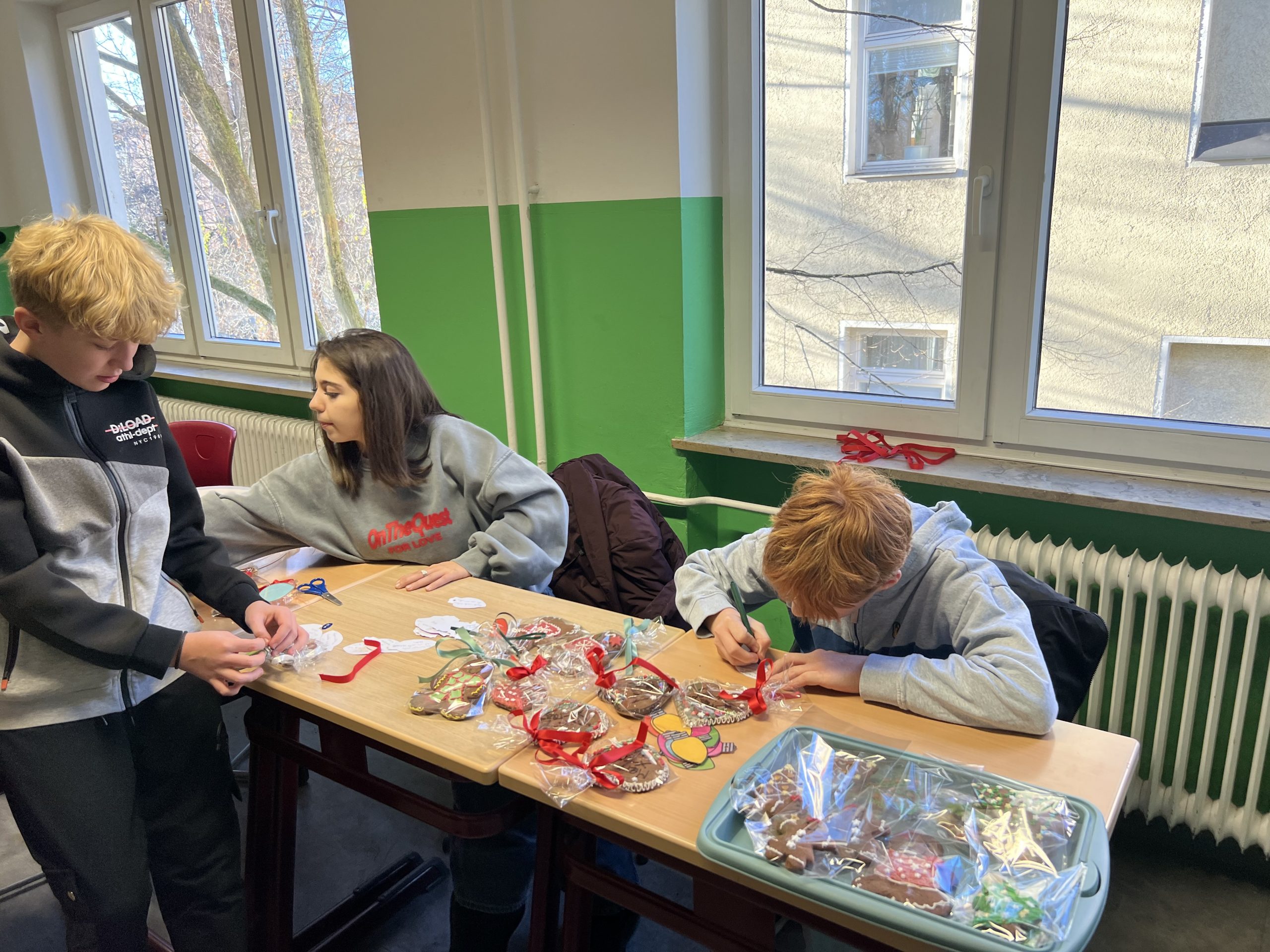 Richtig lebendig wurde es dann an den Ständen: Die Tombola lockte mit tollen Preisen und strahlenden Gesichtern, wenn die richtige Nummer gezogen wurde. Schülerinnen und Schüler verkauften selbstgemachte Perlenketten und Badekugeln – kleine Unikate, die zeigen, wie viel Kreativität in unserer Schulgemeinschaft steckt. Eltern brachten Leckereien aus aller Welt mit, die von Schülerinnen und Schülern verkauft wurden: ein kulinarischer Spaziergang durch verschiedene Kulturen, der Vielfalt ganz praktisch erlebbar machte. Draußen hielten Bratwürste, Kinderpunsch und Glühwein die Gäste warm. Für ein besonderes Andenken war ebenfalls gesorgt: Wer wollte, konnte ein Foto mit dem Weihnachtsmann machen – und natürlich blieb die Frage im Raum, welcher Lehrer wohl im Kostüm steckte. Zwischen vielen Weihnachtsmannmützen mischten sich sogar zwei Dinos in die Menge – ein fröhlicher Farbtupfer, der zeigt, dass Humor bei uns dazugehört.